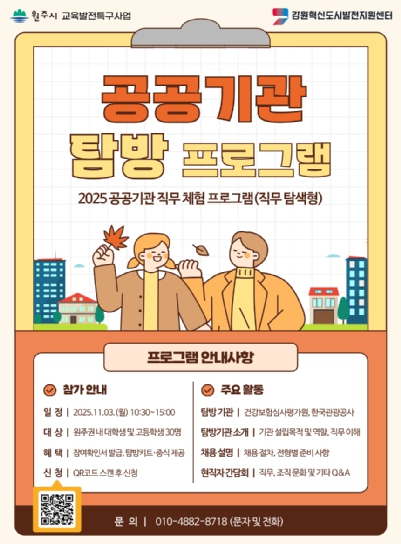 [메이저뉴스](재)강원혁신도시발전지원센터는 원주시 교육발전특구 사업의 일환으로, 오는 11월 3일 원주권 내 청년들의 공공기관 진로 탐색 지원하기 위한 ‘2025 공공기관 직무 체험 프로그램(직무 탐색형)_공공기관 탐방’을 운영한다.