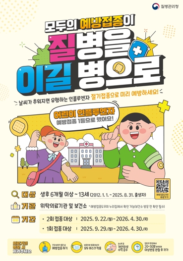 국가에서 지원하는 독감 예방접종 대상 어린이는 생후 6개월∼13세(2012년 1월 1일∼2025년 8월 31일 출생)로, 주민등록지와 관계없이 가까운 지정 의료기관이나 보건소에서 접종받을 수 있다.