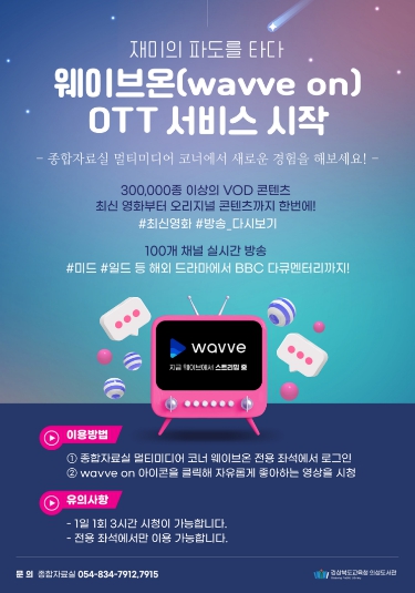 [메이저뉴스]경상북도교육청 의성도서관(관장 이미경)은 오는 13일부터이용자가 필요로 하는 영상을 실시간으로 제공하는 ‘웨이브온 VOD(Video On Demand)’ 서비스를 운영한다고 밝혔다.