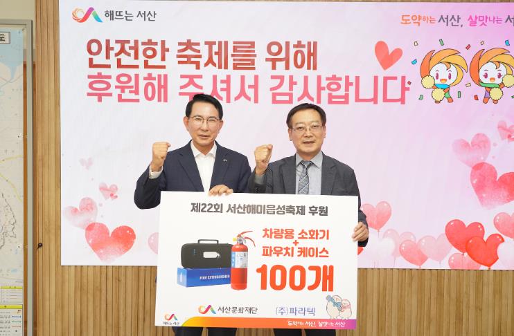 이완섭 서산시장은 “축제의 안전을 위해 귀중한 물품을 기탁해주신 ㈜파라텍에 깊이 감사드린다”며 “서산시와 문화재단도 안전하고 품격 있는 축제를 만들기 위해 최선을 다하겠다”고 전했다.