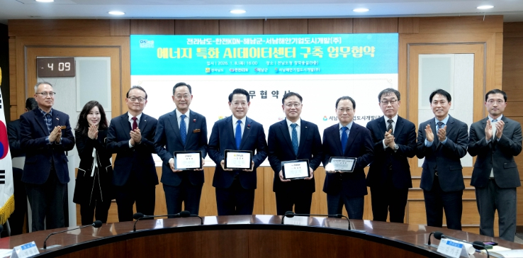 [메이저뉴스]전라남도는 8일 한전KDN, 해남군, 서남해안기업도시개발㈜와 에너지 특화 AI 데이터센터 구축 및 AI·에너지 신산업 육성을 위한 업무협약을 했다.