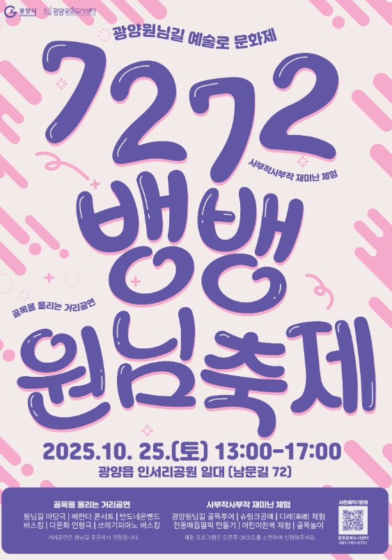 [메이저뉴스]광양문화도시센터는 오는 10월 25일 금요일 오후 광양읍 인서리공원 일대에서 광양원님길 브랜드 축제 ‘7272뱅뱅원님축제’를 개최한다고 밝혔다.
