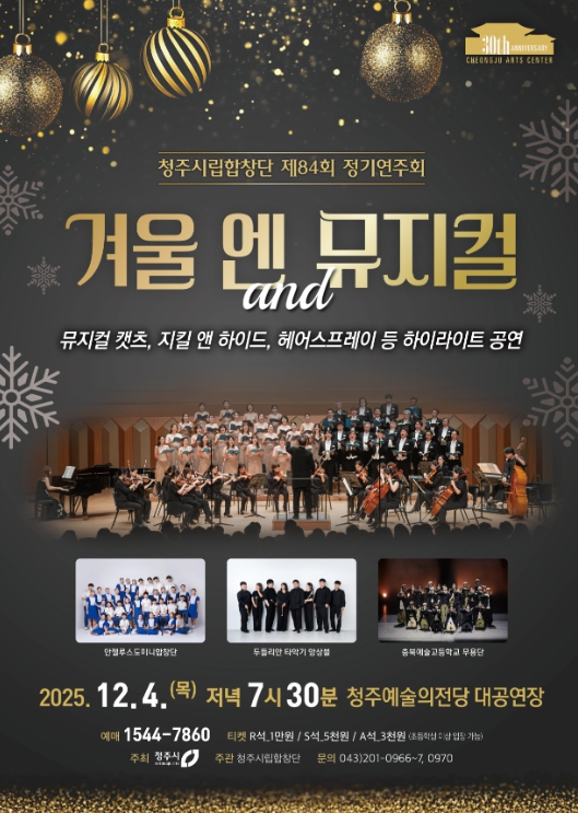 이민영 예술감독 겸 상임지휘자는 “이번 공연을 통해 시민들에게 보다 친숙하고 풍성한 문화 향유의 기회를 제공하고자 한다”며 “연말을 맞아 가족, 친구, 연인과 함께 즐길 수 있는 따뜻한 공연으로, 청주시민들의 문화적 감수성을 높이는 데 기여하겠다”고 밝혔다.