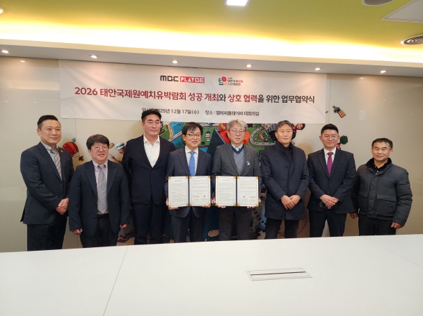 [메이저뉴스]태안국제원예치유박람회 조직위원회는 12월 17일 서울 키자니아 본사에서 글로벌 어린이 직업체험 브랜드 키자니아 운영사인 ㈜엠비씨플레이비와 업무협약을 체결했다고 밝혔다. 이번 협약은 '2026 태안국제원예치유박람회' 개최를 앞두고 어린이와 가족 단위 관람객 유입을 확대하고, 체험 중심의 박람회 콘텐츠를 강화하기 위해 추진됐다.