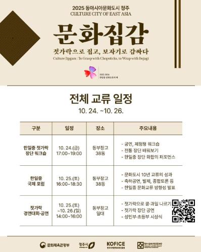 청주문화재단 변광섭 대표는 “이번 2025 동아시아문화도시 교류사업은 국경과 언어, 문화의 차이를 넘어 동아시아문화도시 3국의 문화를 젓가락으로 집고 보자기로 감싸며 한데 어우러지는 화합의 축제”라며 “한국을 대표하는 문화도시이자 2025 청주공예비엔날레가 한창인 글로벌 공예도시 청주에서, 한·일·중 3국의 문화와 함께 소중한 추억을 만들어보시길 바란다”라고 초대의 말을 전했다.