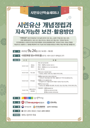 [메이저뉴스]경기문화재단은 오는 10월 24일 오후 2시, 수원문화원 빛누리아트홀에서 ‘시민유산 개념정립과 지속가능한 보전·활용방안’ 학술 세미나를 개최한다고 밝혔다. 세미나는 문화유산을 소수 전문가의 영역에서 시민 모두의 유산으로 확장하고, 그 가치를 지속가능하게 보전, 활용하는 방안을 모색하기 위해 기획됐다.