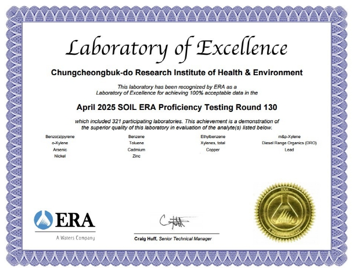 [메이저뉴스]충북보건환경연구원(원장 임헌표)이 2025년에 실시한 수질·먹는물·토양 등 8개 환경분야 측정분석 숙련도 평가에서 모두 ‘만족(Satisfactory)’ 평가를 받아 분석능력이 탁월함을 다시 한번 국내외로부터 공식 인정 받았다고 밝혔다.