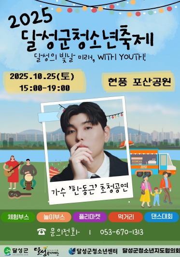 [메이저뉴스]달성군청소년센터(관장 류명구)는 25일 오후 3시부터 현풍 포산공원에서 ‘달성의 빛날 미래, With Youth’를 주제로 청소년과 지역주민을 위한 ‘2025 달성군 청소년 축제’를 개최한다고 밝혔다.