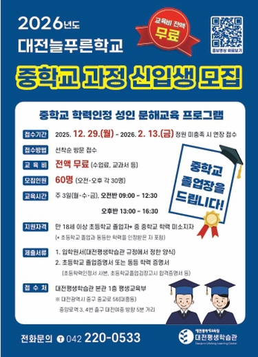 [메이저뉴스]대전평생학습관은 2026년 2월 13일까지 2026년 대전늘푸른학교 중학교 학력인정 과정 신입생을 모집한다고 밝혔다.