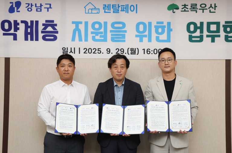 [메이저뉴스]꿈이 모이는 도시, 미래를 그리는 강남구가 9월 29일 렌탈페이, 초록우산과 함께 주거취약계층 지원을 위한 3자간 업무협약(MOU)을 체결했다.