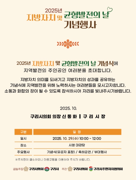 [메이저뉴스]구리시의회는 오는 10월 29일에 구리시청 1층 대강당에서 ‘2025년 지방자치 및 균형발전의 날 기념식’을 개최한다.