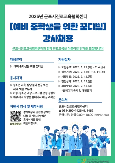 [메이저뉴스](재)군포시청소년재단 군포시진로교육협력센터는 관내 예비중학생의 학교 적응과 진로 기초 역량 강화를 위해 '2026년 군포시진로교육협력센터 예비중학생을 위한 꿈디딤' 프로그램에 참여할 강사를 채용한다고 밝혔다.