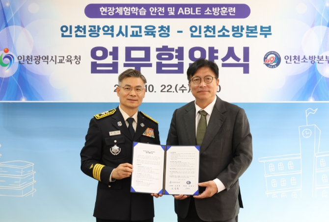 [메이저뉴스]인천광역시교육청은 22일 인천소방본부(본부장 임원섭)와 ‘현장체험학습 안전요원 및 ABLE 소방훈련 협력을 위한 업무협약’을 체결했다.