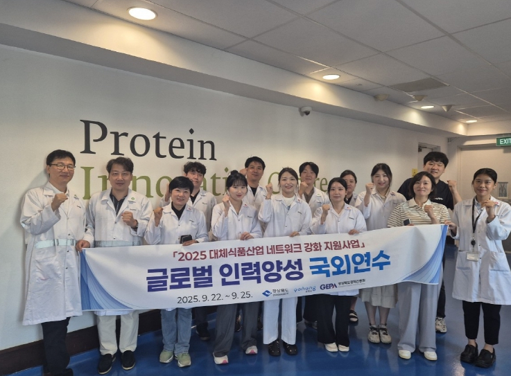 이번 연수에는 대체식품·배양육·바이오소재 관련 기업 13곳이 참가했으며, 싱가포르 단백질 혁신센터에서 압출기 기초원리 교육, 압출 고급기술 실습 등 대체식품 생산에 필요한 핵심 기술을 익혔다.