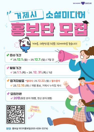 [메이저뉴스]거제시는 시정과 지역의 매력을 널리 알릴'제7기 거제시 소셜미디어 홍보단'을 12월 1일부터 12월 7일까지 공개 모집한다고 밝혔다.