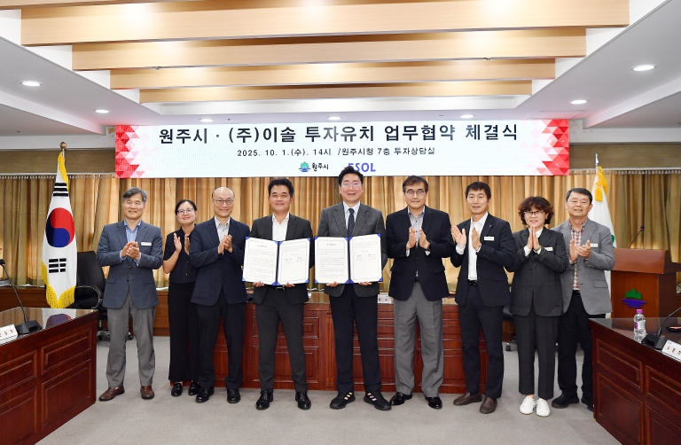 [메이저뉴스]원주시는 10월 1일 오후 2시, 시청 7층 투자상담실에서 ㈜이솔(대표 김병국)과 투자유치 협약(MOU)을 체결했다. 이번 협약은 총 505억 원 규모의 투자로, 부론일반산업단지에 소형 방사광가속기와 첨단 EUV 반도체 검사장비 연구·생산시설을 구축하는 사업이다. EUV(Extreme Ultra-Violet)는 반도체 초미세 공정(7nm 이하)에 필수적인 광원이다.