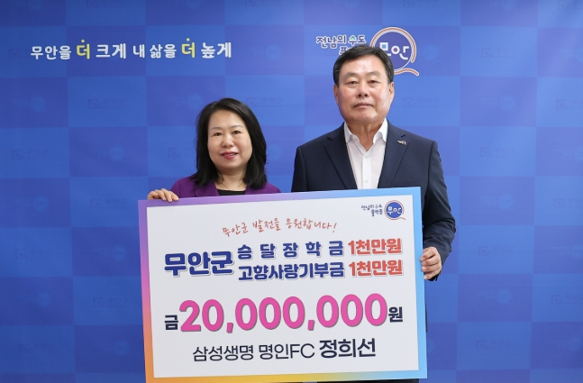 [메이저뉴스]전남 무안군은 1일 삼성생명 정희선 명인FC가 지역 인재 양성과 지역 발전을 위해 소중히 써달라며 승달장학금 및 고향사랑기부금 각 1천만 원, 총 2천만 원을 기탁했다고 밝혔다.