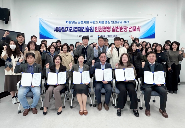 [메이저뉴스]세종일자리경제진흥원(원장 이홍준)은 21일 본원 2층 교육실에서 ‘인권경영 실천헌장 선포식’을 열고 모든 임직원이 인권을 경영의 핵심 가치로 삼아 실천해 나갈 것을 다짐했다.