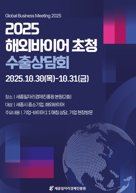 [메이저뉴스]세종일자리경제진흥원은 오는 30일부터 31일까지 이틀간 진흥원 본원에서 ‘2025 해외바이어 초청 수출상담회’를 개최한다고 밝혔다.