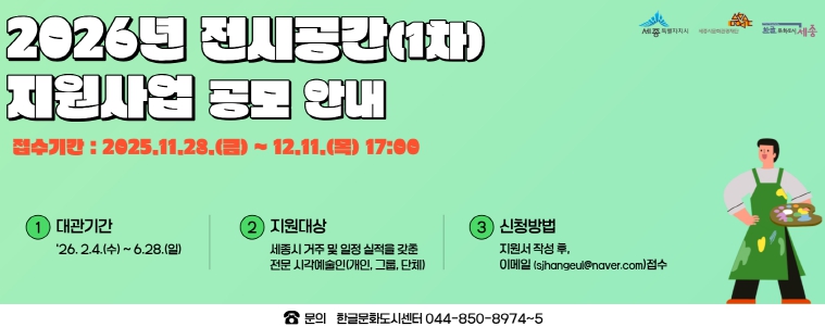 [메이저뉴스] 세종시문화관광재단 한글문화도시센터는 11월 28일부터 12월 11일까지 지역 시각예술*인의 창작활동을 지원하기 위해 ‘2026년 전시공간 지원사업(1차)’ 공모를 진행한다.