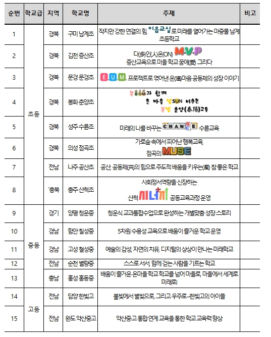 이번 공모전에는 전국 농어촌 지역에서 초등학교 47개교, 중학교 29개교 고등학교 15개교 등 총 91개교의 우수사례가 접수됐다. 1차 서면 심사와 2차 현장 실사 등을 거쳐 총 15개교(초등학교 8개교, 중학교 5개교, 고등학교 2개교)가 최종 선정됐다.