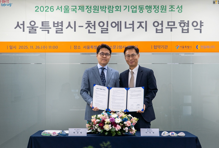 [메이저뉴스]서울시는 2026년 서울숲에서 개최되는 서울국제정원박람회 내에 기업동행정원 조성을 위해 ESG 경영에 힘쓰고 있는 천일에너지와 11월 26일 업무협약을 체결했다.
