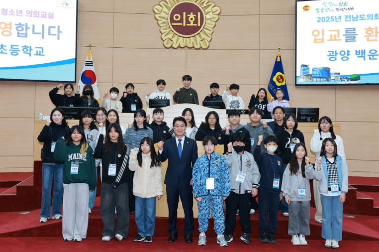 [메이저뉴스]전라남도의회 김태균 의장(더불어민주당, 광양3)은 지난 20일, 전라남도의회 본회의장에서 열린 ‘2025년 제24회 청소년 의회교실’에 참석해 광양 백운초등학교 학생들과 공감의 시간을 가졌다.