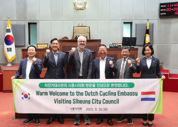 [메이저뉴스]시흥시의회 도시환경위원회가 9월 30일 의회청사 소담뜰에서 네덜란드 자전거대사관(Dutch Cycling Embassy, DCE)을 초청해 간담회를 열고, 시흥시 자전거 정책 발전 방향과 친환경 교통 시스템 구축 방안에 대해 논의했다.