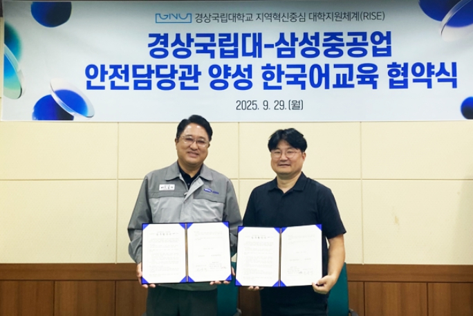 [메이저뉴스]경상국립대학교 RISE사업단 산학친화프로그램과 삼성중공업은 9월 29일 오후 가좌캠퍼스 언어교육실 국제교육부처장실에서 외국인 근로자의 안전한 근로환경 조성과 지역사회 정주 여건 조성을 위해 ‘외국인 근로자 대상 한국어 교육체계 구축에 관한 업무협약’을 체결했다.
