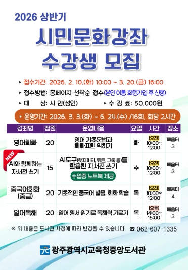 [메이저뉴스]광주광역시교육청중앙도서관은 오는 3월 3일부터 6월 24일까지 도서관 배움터실 등에서 ‘2026년도 상반기 시민문화강좌’를 운영한다.