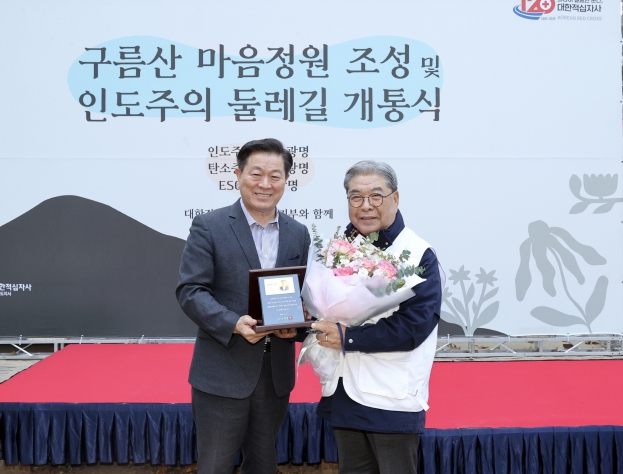 시는 14일 구름산 산림욕장에서 대한적십자사 경기도지사와 함께 개최한 ‘마음정원 조성 및 인도주의길 개통식’에서 이 회장에게 광명시 명예시민증을 수여했다.