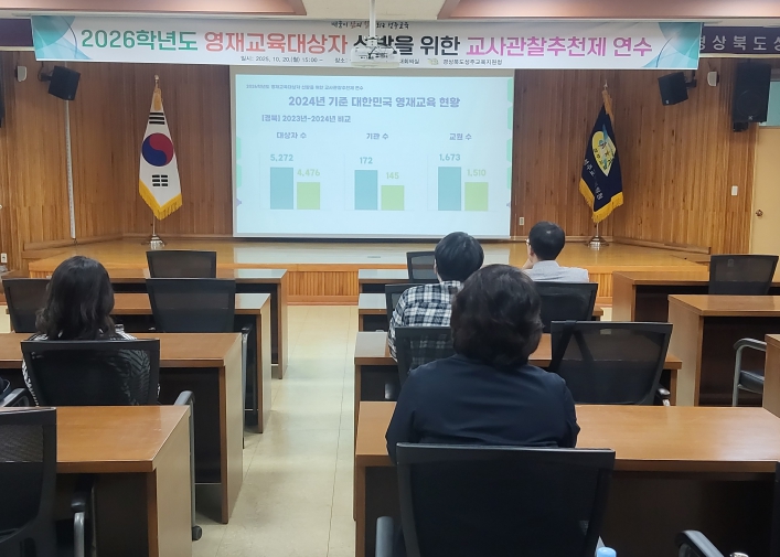 [메이저뉴스]경상북도성주교육지원청은 10월 20일 오후 3시에 성주교육지원청 대회의실에서 관내 초, 중등학교 영재 교육 담당 교사 19명을 대상으로 2026학년도 영재교육대상자 선발을 위한 교사관찰추천제 연수를 실시했다.