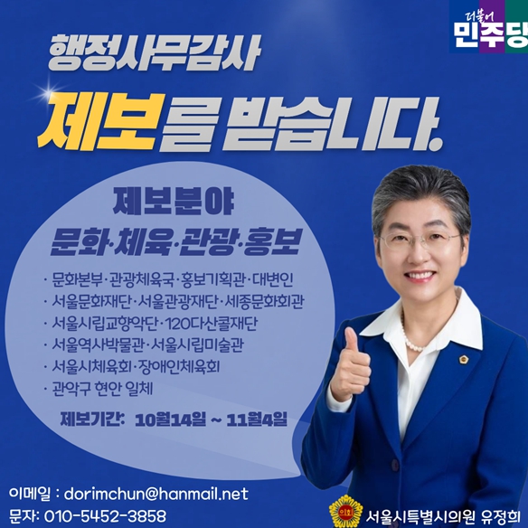 [메이저뉴스]서울특별시의회 문화체육관광위원회 유정희 의원(더불어민주당, 관악4)은 10월 14일부터 11월 4일까지 시민 의견을 직접 접수받는 ‘행정사무감사 시민제보창구’를 운영한다고 밝혔다.