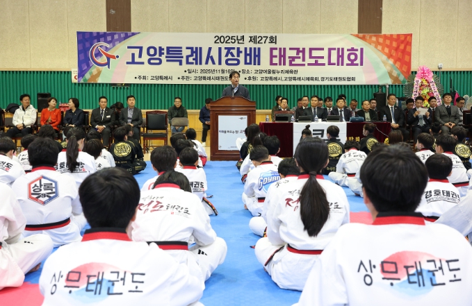 [메이저뉴스]2025년 제27회 고양특례시장기 태권도대회가 16일 고양어울림누리 체육관에서 개최됐다. 이동환 고양특례시장은 “갈고닦은 실력과 기량을 유감없이 발휘해 후회 없는 경기를 펼쳐주길”이라고 말했다.