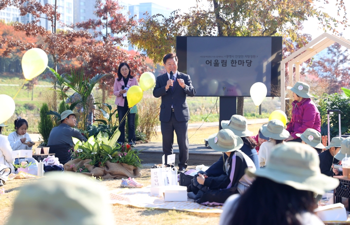| ▲ 박승원 광명시장이 지난 15일 안양천 지방정원 시범구간에서 개최한 '정원 어울림 한마당'에 참석해 인사말을 하고 있다. |