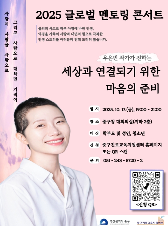 [메이저뉴스] 부산 중구는 중구 진로교육지원센터 주관으로 오는 10월 17일 오후 7시, 중구청 지하2층 대회의실에서 '2025 글로벌 멘토링 콘서트'를 개최한다.