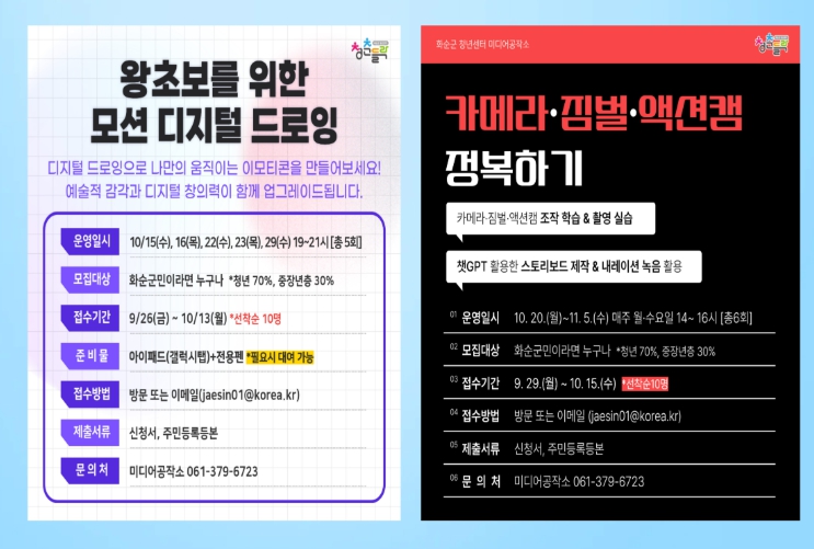[메이저뉴스]화순군(군수 구복규)은 오는 10월 15일과 20일 화순군 청년센터(청춘들락) 미디어공작소에서 영상 제작과 디지털드로잉 분야의 창의적 미디어 교육 프로그램을 시작한다고 밝혔다.