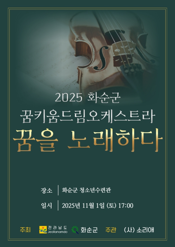 [메이저뉴스]화순군은 오는 11월 1일 토요일 오후 5시 화순군 청소년수련관에서 화순군 꿈키움 드림오케스트라 연주발표회『꿈을 노래하다』 무료 공연을 개최한다고 밝혔다.