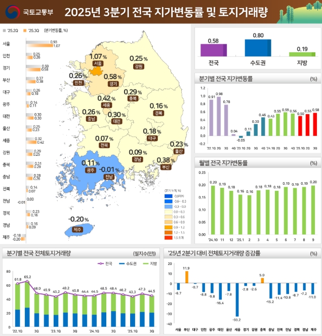 [메이저뉴스]국토교통부와 한국부동산원(원장 손태락)은 '25년 3분기 지가변동률 및 토지거래량을 발표했다.