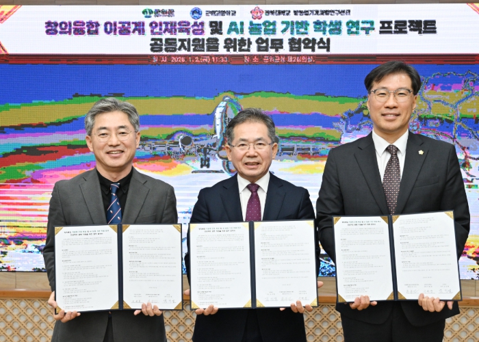 [메이저뉴스]군위군이 1월 2일 군청 제2회의실에서 군위고등학교, 경북대학교 밭농업기계개발연구센터와 함께 창의융합 이공계 인재 육성 및 AI 농업 기반 이공계 인재 육성을 위한 학생 연구 프로젝트 공동 지원 업무협약을 체결했다.