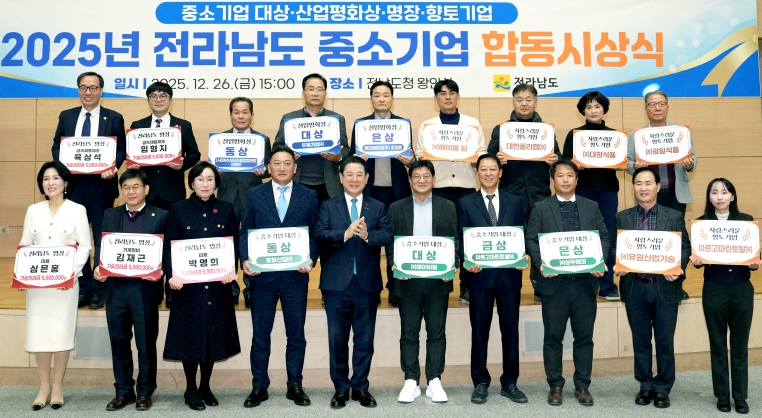 [메이저뉴스]전라남도는 26일 중소기업의 성장과 산업현장 숙련기술인의 공로를 기리기 위해 ‘2025 중소기업 합동 시상식’을 열고 기업경영·노사화합·숙련기술 등 각 분야에서 우수한 성과를 거둔 기업과 개인을 시상했다.