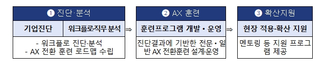 ③ 3단계(확산지원): 훈련 종료 후에도 현장 적용 시 발생하는 문제를 해결할 수 있도록 전문가의 ‘밀착형 코칭’을 지원하고, 우수사례 공유회를 개최해 인공지능 전환(AX) 성과를 확산시킨다.