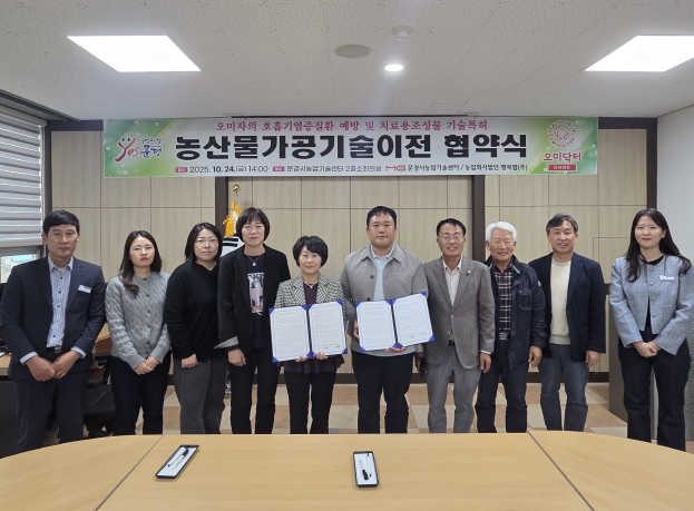 [메이저뉴스] 문경시농업기술센터는 10월 24일 농업기술센터 소회의실에서 “오미자, 배, 도라지추출물을 포함하는 호흡기 염증질환 예방 또는 치료용 조성물”(특허번호 제 : 10-2169920호) 특허기술을 관내업체인 “농업회사법인 행복팜(주)”에 이전하는 기술이전 협약식을 체결했다.