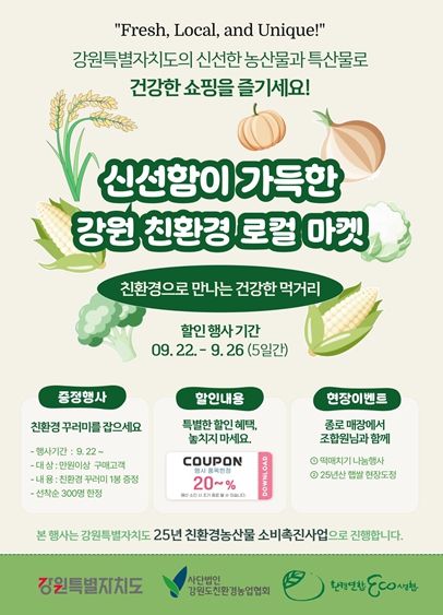 [메이저뉴스]강원특별자치도는 9월 22일부터 26일까지 5일간 두레생협 전국 111개 매장에서 '강원특별자치도 친환경 로컬마켓 2탄'을 동시에 개최한다고 밝혔다.