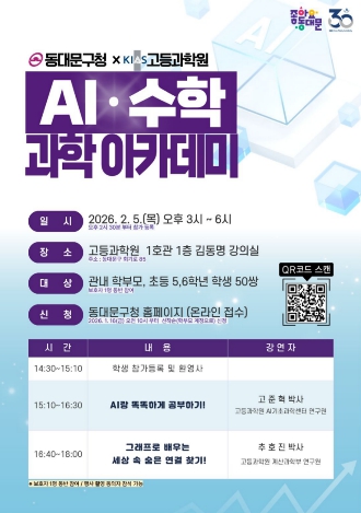 [메이저뉴스]서울 동대문구가 겨울방학을 맞아 홍릉에 자리한 고등과학원(KIAS)과 손잡고 ‘AI·수학 과학아카데미’를 연다. 아이 혼자 ‘학원’으로 향하는 대신, 부모와 함께 강연장을 찾아 같은 내용을 듣고 집으로 돌아가는 길에 자연스럽게 대화를 이어가게 하는 ‘가족 소통형’ 프로그램이다.