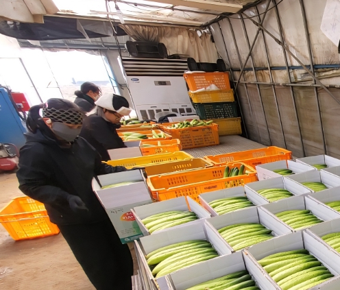 | ▲ 1. 천안 하늘그린오이 재배 농가가 수확한 오이를 상자에 담고 있다. |