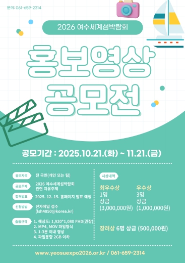[메이저뉴스](재)2026여수세계섬박람회조직위원회가 11월 21일까지 ‘2026여수세계섬박람회 홍보영상 공모전’을 개최한다.