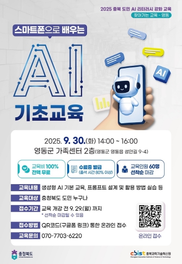 [메이저뉴스]충북도와 충북과학기술혁신원(원장 고근석)은 도민들의 인공지능 활용 역량을 높이기 위해 오는 9월 30일 오후 2시부터 4시까지 영동군 가족센터 2층에서 '스마트폰으로 배우는 AI 기초교육'을 개최한다.