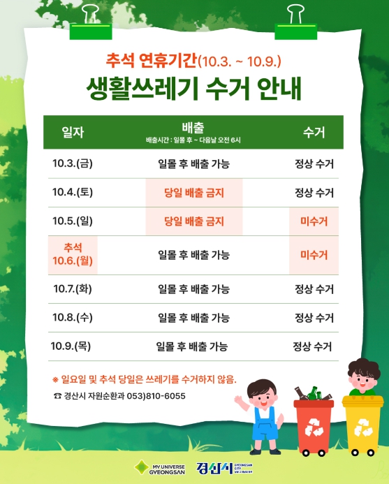 또한, 쓰레기 처리시설 및 수거 대행업체 휴무로 연휴 기간 중 10월 5일부터 10월 6일은 쓰레기 수거가 중단됨에 따라 이날 발생된 쓰레기는 가급적 배출을 자재하고 가정에 보관했다가 수거 전날에 배출해 줄 것을 당부했다.