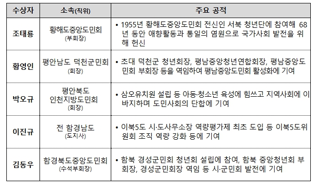 한편, 이번 대회에서는 올해 ‘국가사회발전 이북도민 유공’ 정부포상자로 선정된 39명 중 5명의 유공도민에게 국민훈장 동백장이 수여된다.